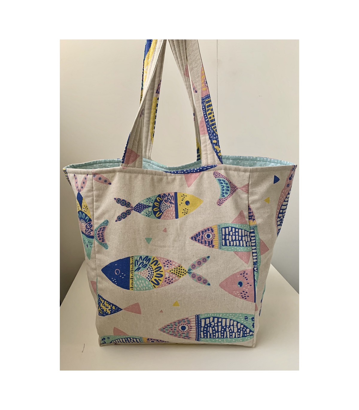 Amb els materials i instruccions d'aquest kit podreu confeccionar aquesta gran bossa molt pràctica amb un divertit estampat de peixos de Katia, molt adient per anar a la platja.