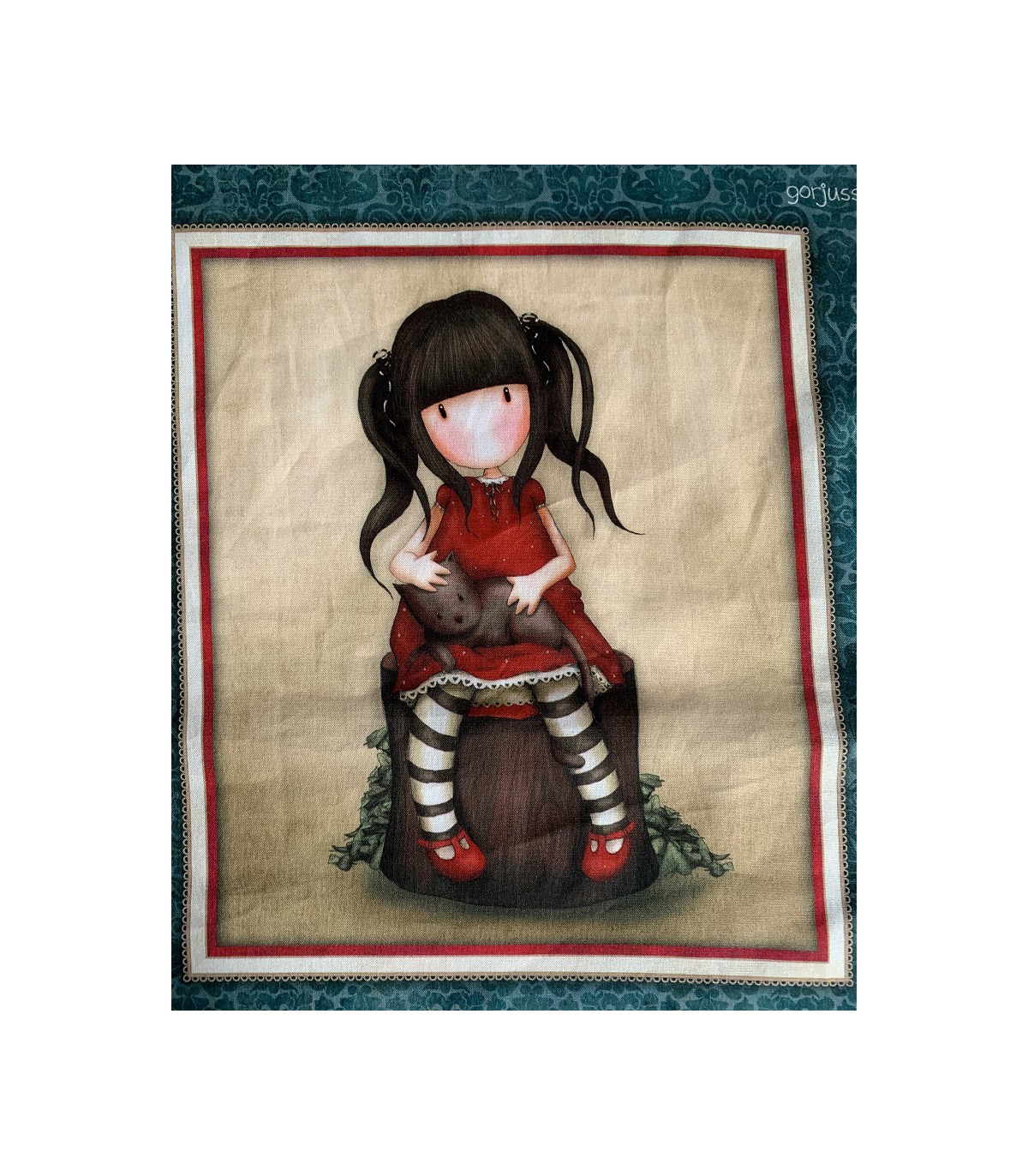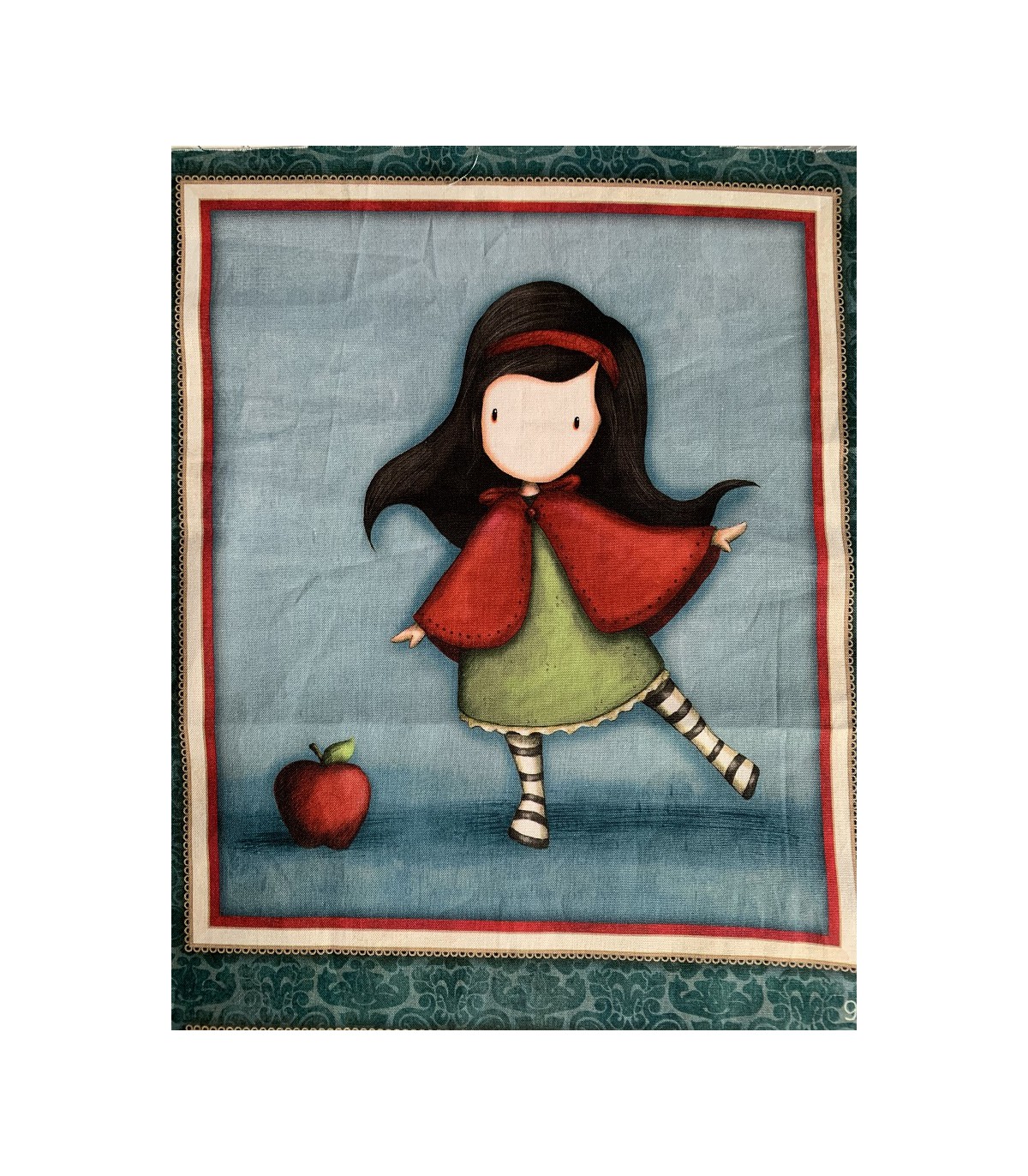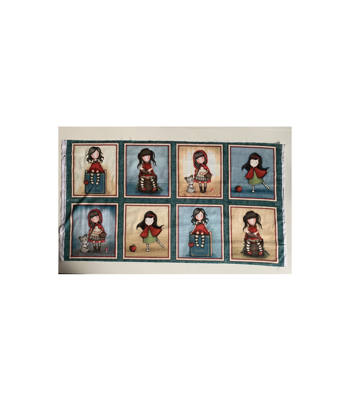 Panell estampat apaïsat amb les boniques i originals nines de Gorjuss, permet treballar-se sencer (110x60cm) o dividit, obtenint 8 petits panells de 4 nines diferents sobre dos colors de fons, un blau i l'altre cru.