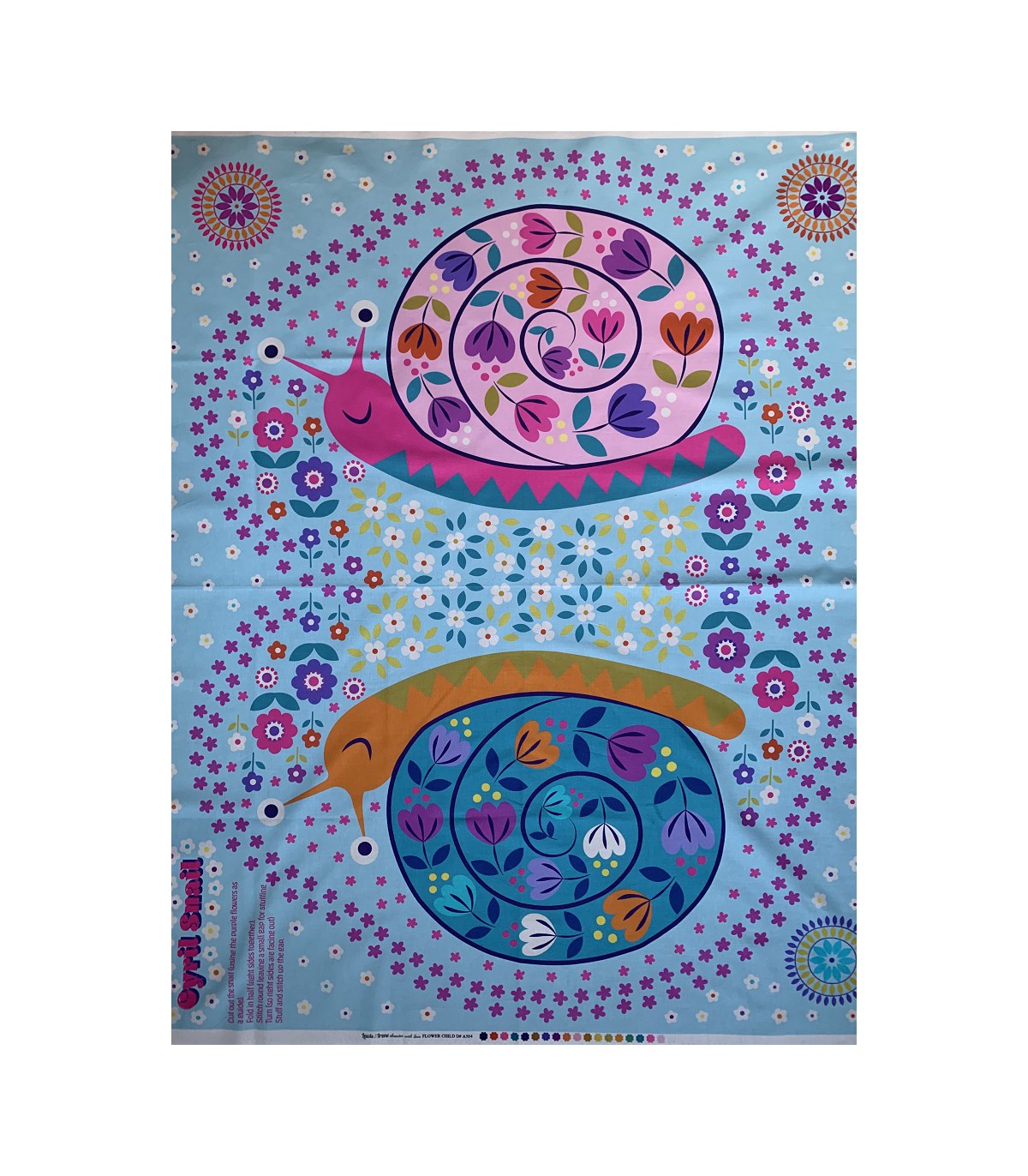 Panell infantil molt colorit que permet fer un gran coixí amb forma de cargol o una gran manteta de joc o pel llit.