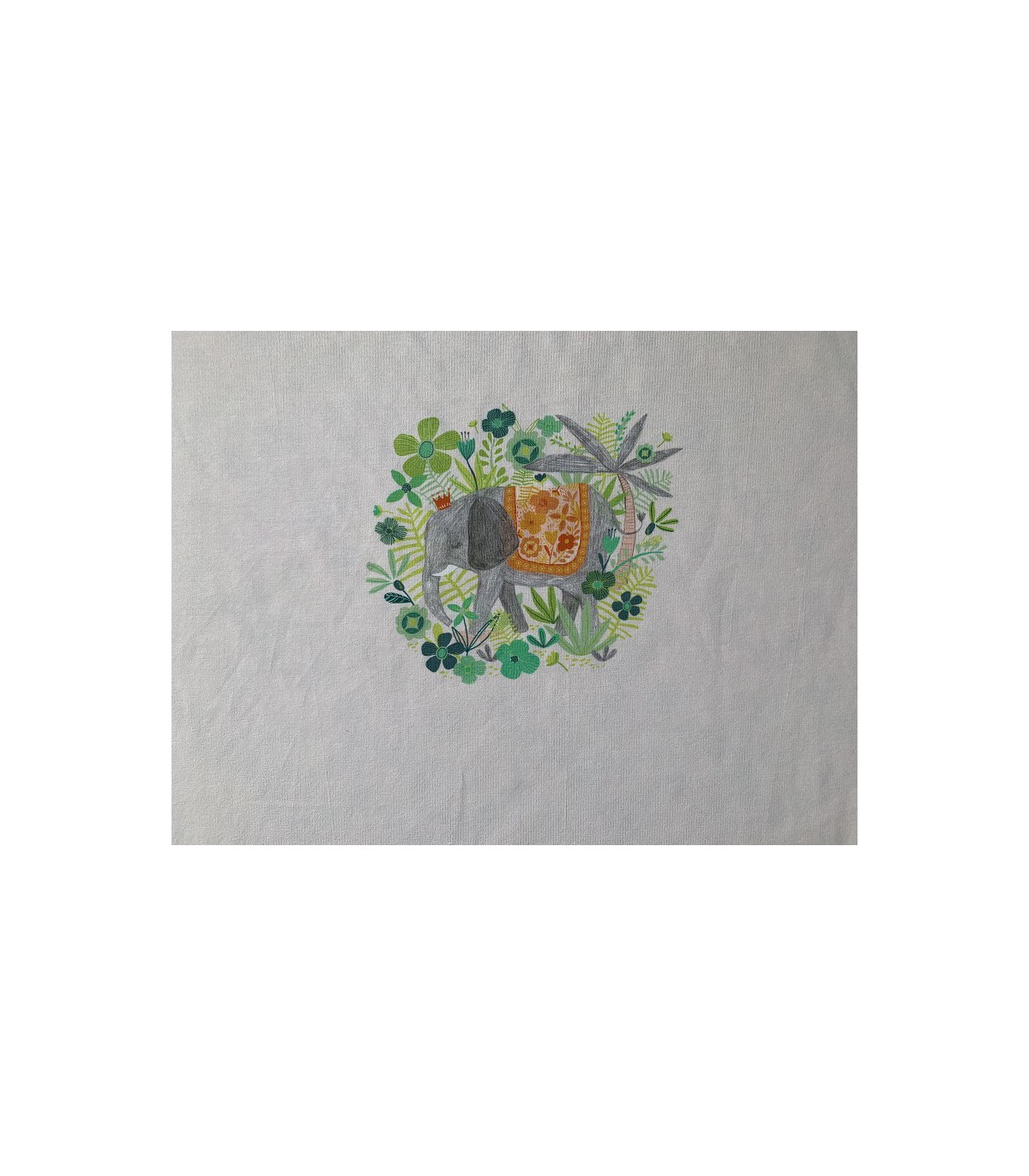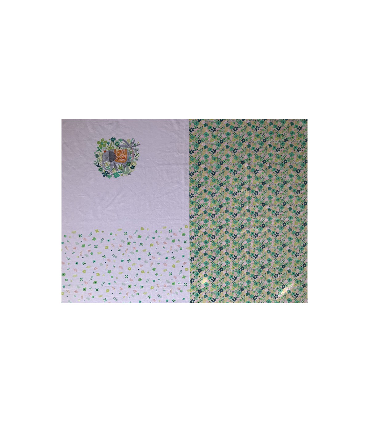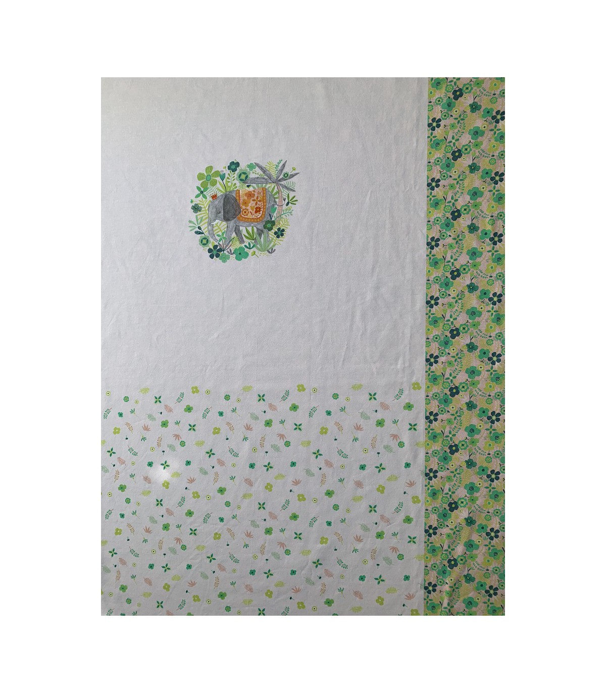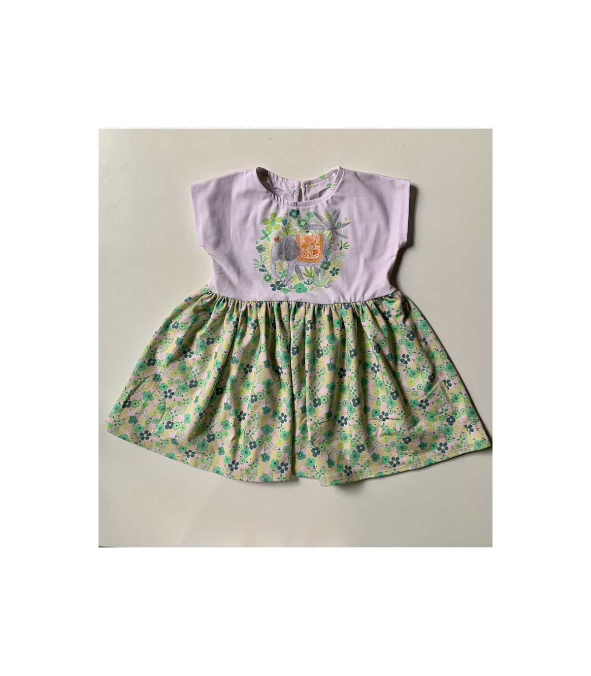 Panell de jersei de 150 x 100 cm de la col·lecció Jumbo de Katia, plena de detalls on destaquen els estampats caleidoscópicos de vibrants colors...) aquest permet confeccionar un vestit amb estampat frontal amb elefant, floreta petita per la part de l'esquena i floreta més gran de color més intens per la faldilla amb patrons per a nenes de 12 mesos fins a 12 anys segons les explicacions que podem trobar en la revista Fly (Spring/Summer) de Katia.