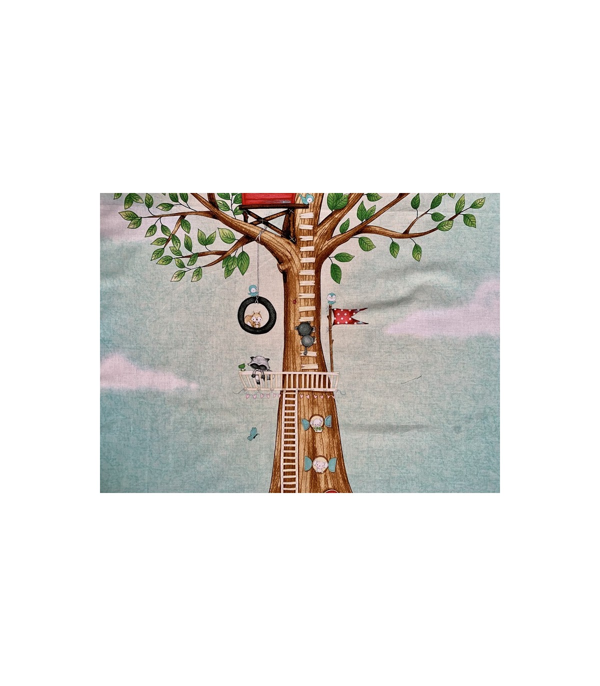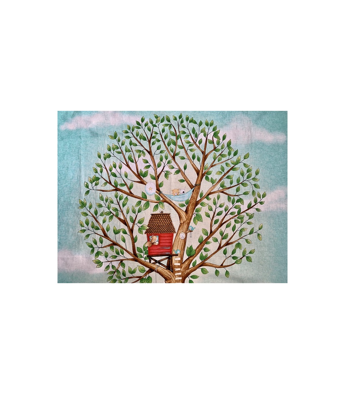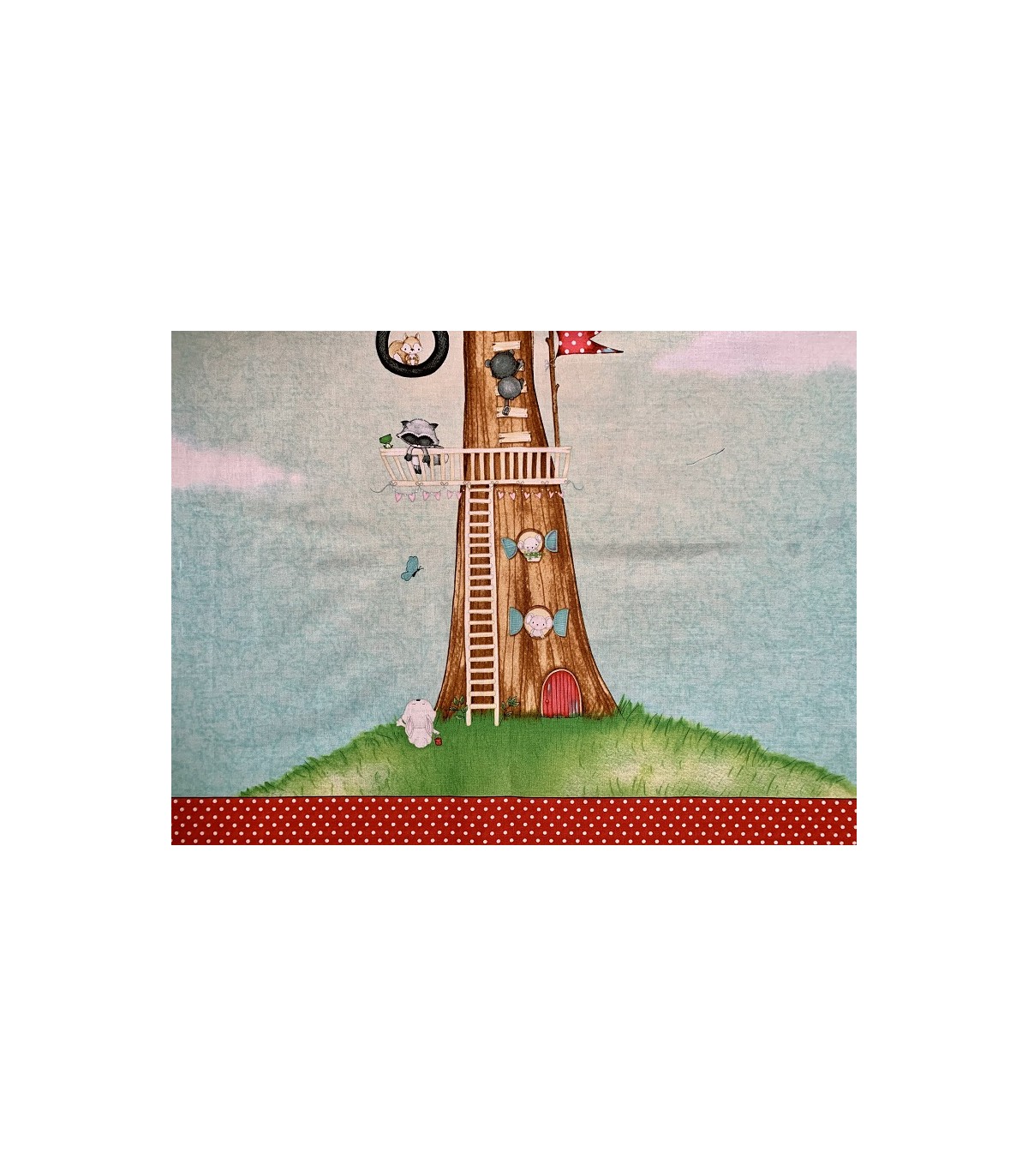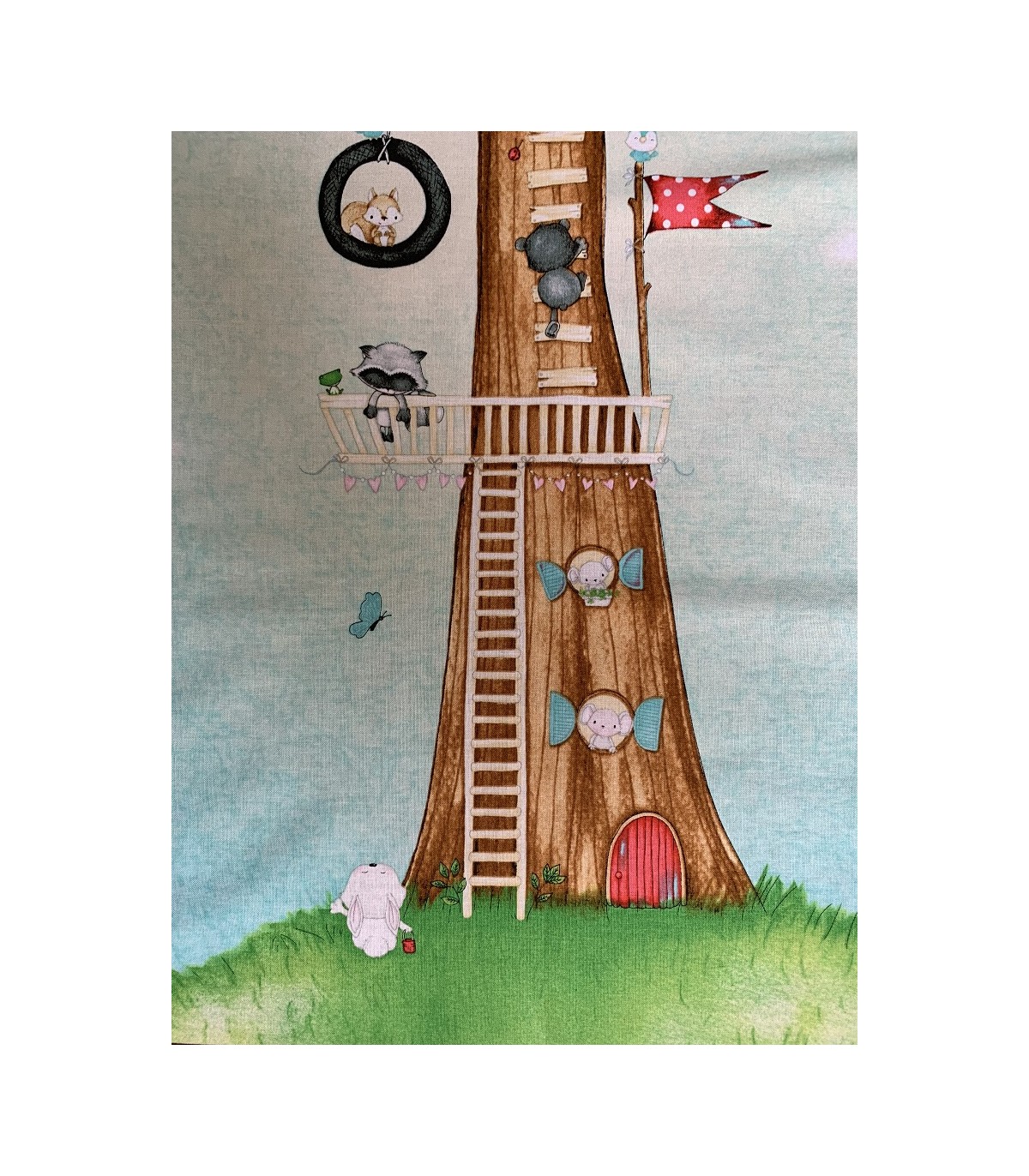 Panel de QT fabrics (Quilting Treasures) de 90 x 110 cm diseño de Stacey Yacula con sus dulces animalitos jugando en la casita del árbol.